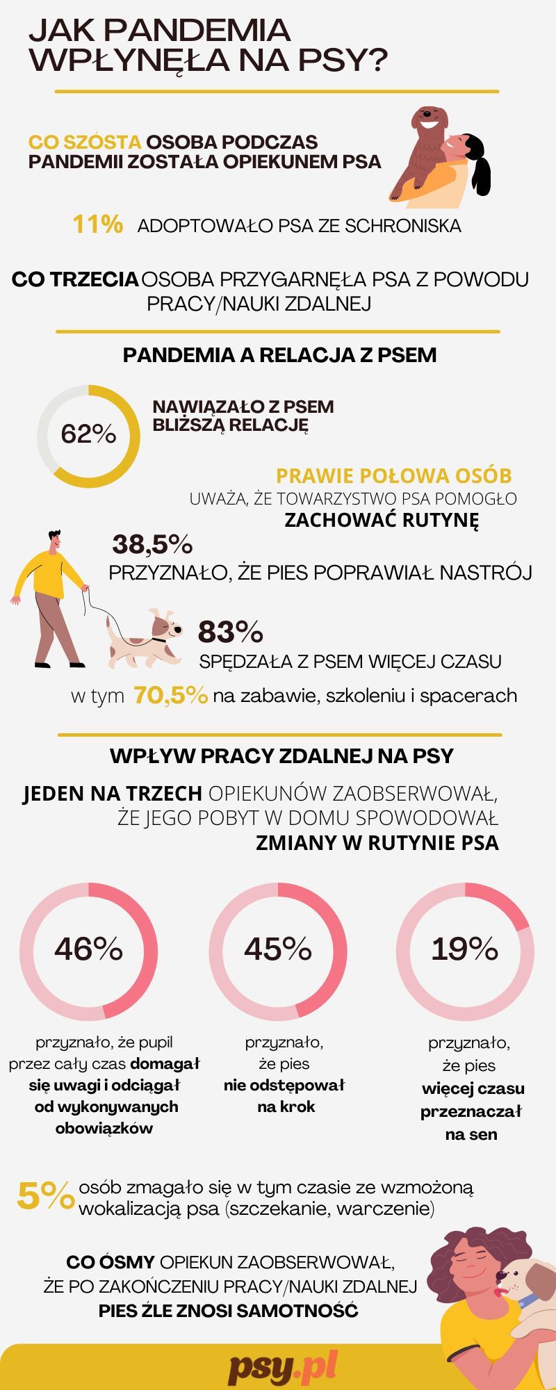 Pandemiczne obostrzenia znacząco wpłynęły na dobrostan psychiczny wielu ludzi – z dnia na dzień trzeba było dostosować się do nowej rzeczywistości. Codzienność zdominowały lęk, samotność czy brak poczucia bezpieczeństwa. Dla wielu ludzi receptą idealną okazały się wówczas zwierzęta domowe. W ostatnich latach psy stały się bardzo ważną częścią naszego życia, a w czasie pandemii były bliżej swoich opiekunów niż kiedykolwiek wcześniej. Dlatego też nikogo nie dziwi fakt, że dla wielu opiekunów są one pełnoprawnymi członkami rodziny – co deklaruje blisko 90% respondentów. Natomiast co 10 ankietowany uważa swojego psa za przyjaciela. Według wyników ogólnopolskiej ankiety przeprowadzonej przez portal Psy.pl aż 87% badanych przyznało, że miało psa przed pandemią, a niemal co szósty respondent deklaruje, że to właśnie podczas lockdownu zdecydował się zostać opiekunem zwierzęcia.