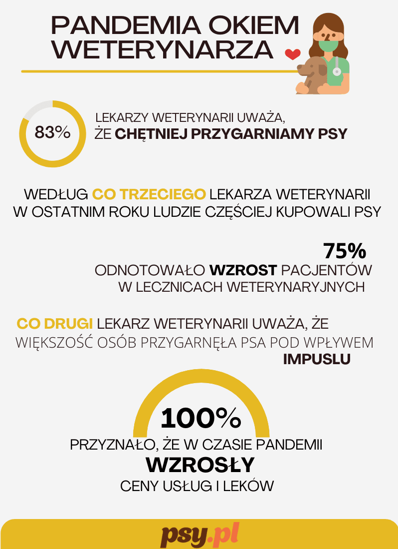 W życiu psa oprócz opiekuna również ważną osobą jest lekarz weterynarii. Czy w czasie pandemii coś się w tej kwestii zmieniło? W ciągu ostatniego roku 75% weterynarzy odnotowało wzrost pacjentów w lecznicach weterynaryjnych, w których pracują. Pandemia spowodowała też, że więcej ludzi chętniej przygarnia zwierzęta – tak twierdzą lekarze weterynarii. Niemal 42% weterynarzy uważa, że wśród nowych klientów większość to osoby, które decyzję o przygarnięciu psa podjęły impulsywnie, a 83,3% lekarzy zaobserwowało, że nowi pacjenci kliniki to psy osób, które wcześniej nie pojawiały się w klinice i nie miały zwierzaka. Według co trzeciego weterynarza w ciągu ostatniego roku ludzie częściej kupowali psy. Wszyscy lekarze weterynarii jednogłośnie potwierdzili, że w czasie pandemii ceny usług i leków w lecznicach weterynaryjnych wzrosły.