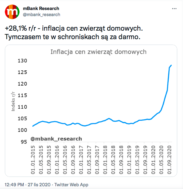 Zwiększone zainteresowanie szczeniakami nie jest jedynym zjawiskiem, które dało się zauważyć w tym czasie. Popyt na zwierzaki wywindował ceny do poziomów, jakich do tej pory nie odnotowano. Ekonomiści mBanku już w 2020 roku udostępnili dane inflacyjne z Głównego Urzędu Statystycznego. Zwierzęta domowe podrożały i to sporo – bo prawie o 30%.