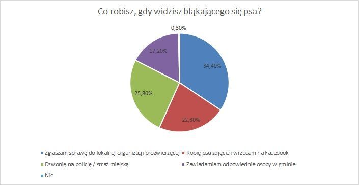 Według wyników ogólnopolskiej ankiety „Jak Polacy traktują zwierzęta?” najwięcej badanych (prawie 35%), widząc błąkającego na ulicy psa, powiadamia o tym lokalną organizację prozwierzęcą. Z kolei 26% ankietowanych zgłasza taką sytuację policji czy straży miejskiej. W siłę internetu wierzy niecałe 23% badanych, którzy deklarują, że robią psu zdjęcie i publikują je na Facebooku. Mają nadzieję, że w ten sposób odnajdzie się właściciel. Co szósty respondent o błąkającym się psie informuje odpowiednie osoby w gminie.
