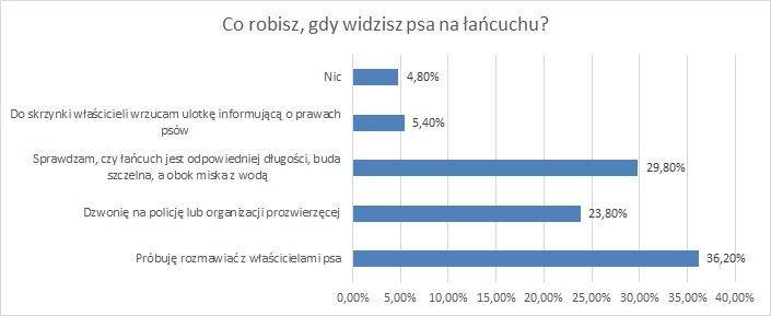 Psiarze są skłonni reagować, kiedy widzą psa na łańcuchu – 36% respondentów deklaruje, że próbuje rozmawiać z właścicielami psa trzymanego na uwięzi. Niewiele mniej osób (prawie 30%) upewnia się, czy łańcuch jest odpowiedniej długości, buda szczelna, a zwierzę ma dostęp do miski z wodą. Z prośbą o interwencję policji lub odpowiedniej organizacji prozwierzęcej występuje blisko 24% osób. Tylko 5% ankietowanych w ogóle nie reaguje, kiedy widzi psa na łańcuchu.