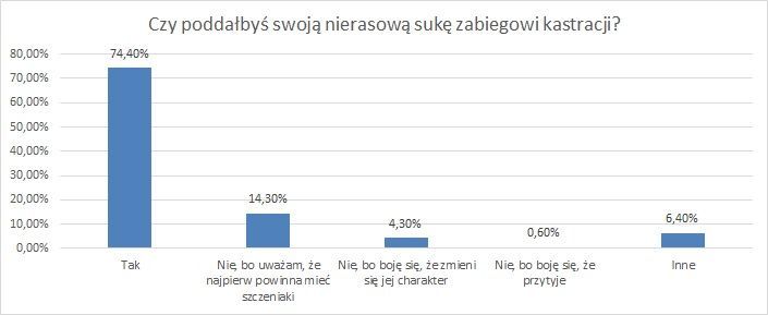 Niemal trzy czwarte ankietowanych (74,4%) deklaruje, że poddałoby swoje nierasowe zwierzę zabiegowi kastracji. Niestety aż 14% biorących udział w badaniu powiela panujący wśród niektórych psiarzy mit – twierdzą oni, że nie zdecydowaliby się na tego typu zabieg, gdyż „suczka najpierw powinna mieć szczeniaki”.