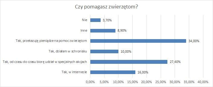87% ankietowanych, na pytanie „czy pomagasz zwierzętom”, odpowiada „tak”. Najczęściej wybieraną przez ankietowanych formą pomocy jest przekazywanie pieniędzy na wsparcie zwierzaków – tak deklaruje 34% ankietowanych. 27,4% uczestników badania od czasu do czasu bierze udział w specjalnych akcjach, np. dniach otwartych schronisk. Prawie 16% badanych deklaruje, że jest wirtualnym opiekunem jakiegoś zwierzęcia lub udostępnia na Facebooku zdjęcia psów potrzebujących pomocy. Wolontariuszami w schroniskach jest blisko 10% osób biorących udział w ankiecie.