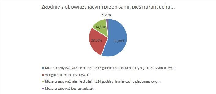 Ponad połowa (55,8%) psiarzy wykazała się znajomością obowiązujących przepisów dotyczących trzymania psów na łańcuchu – wiedzą oni, iż zwierzę może przebywać na nim, ale nie dłużej niż 12 godzin, a sam łańcuch musi mieć minimum trzy metry długości.