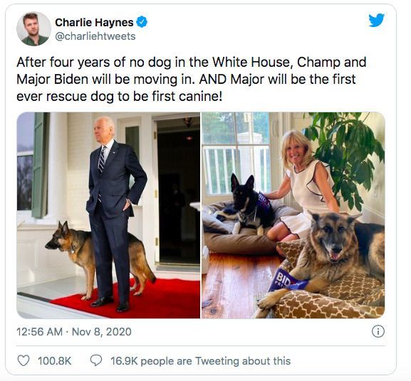 Champ, który pojawił się w rodzinie Bidenów w 2008 roku, będzie też pierwszym psem służbowym (jest wykwalifikowanym psem-ratownikiem), który zamieszka w prezydenckiej rezydencji. Dziesięć lat później Joe i Jill zdecydowali się zaadoptować psa z Delaware Humane Association. Wybrali pupila podobnego typem do starszego „brata”. Major będzie pierwszym w historii psem ze schroniska, który wprowadzi się do Białego Domu.