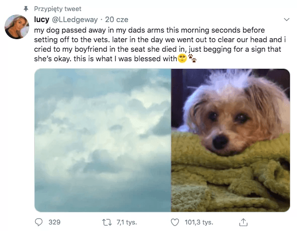 Lucy postanowiła zrobić zdjęcie niebiańskiej podobizny Sunny, aby uwiecznić tę niezwykłą chwilę. Fotografię najpierw wysłała swoim rodzicom, a następnie opublikowała na Twitterze. Post uzyskał ponad 100 tysięcy polubień i został udostępniony 7 tysięcy razy. Okazało się, że Lucy nie jest jedyną osobą, która otrzymała niezwykły znak od swojego zmarłego pupila. Wielu internautów w komentarzach pod postem podzieliło się podobnymi historiami.