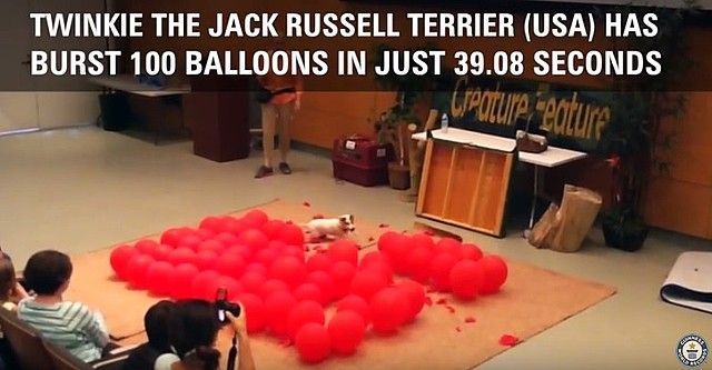 Twinkie, jack russell terrier, przebił teraz 100 czerwonych baloników w 39,08 sekundy, co oznacza, że załatwiał w sekundę 2,5 balonika.