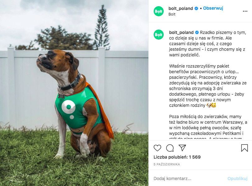 Kiedy w naszym domu pojawia się pies czy kot, chcemy być z nim w tych pierwszych dniach. Dlatego przeważnie decydujemy się na wzięcie urlopu, aby pomóc zwierzęciu zaaklimatyzować się w nowym otoczeniu. Świadczenie zaproponowane przez firmę Bolt zostało odebrane z dużym entuzjazmem. Świadczą o tym chociażby komentarze na Instagramie pod postem na ten temat:
