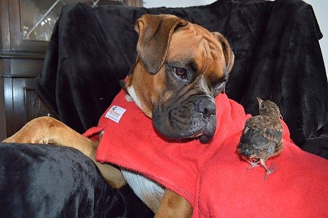 „I bokser, i ptaszek lubią się bawić, uwielbiają swoje towarzystwo i zdają się zwariowani na swoim punkcie z wzajemnością” – opowiada portalowi The Huffington Post Jurgita Peciulaityte z Isle of Sheppy w Anglii, opiekunka boksera Rusty. Wszystko zaczęło się na początku lipca, gdy Jurgita usłyszała, jak Rusty głośno szczeka. Gdy poszła go poszukać w ogrodzie, okazało się, że stoi nad pisklęciem, które nie umie jeszcze fruwać. Nigdzie nie było śladu gniazda.