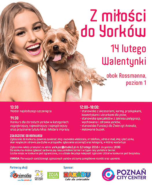 Impreza „Z miłości do yorków” odbędzie się 14 lutego w Poznań City Center na poziomie 1 w pobliżu sklepu Rossmann. Stanowiska z akcesoriami, karmą, przysmakami, kosmetykami i ubrankami dla psów, a także stanowiska specjalistów z zakresu pielęgnacji, wychowania i zdrowia yorków będą otwarte od 12 do 18. Konkursy rozpoczną się o godzinie 13.30.