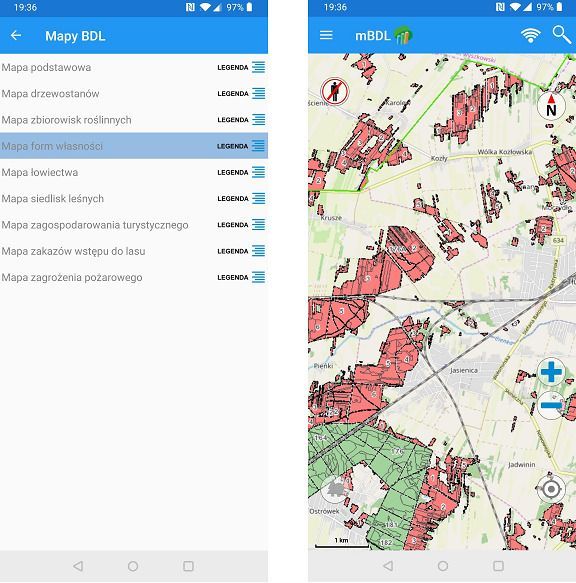 Aplikacja jest darmowa i można ją ściągnąć zarówno z Google Play, jak i App Store. Po włączeniu lokalizacji aplikacja pokaże nam, gdzie jesteśmy, ale oczywiście można też sprawdzić dowolny obszar. Po wybraniu w menu opcji „mapy BDL” warto zaznaczyć „mapę form własności”. Wtedy wszystkie obszary leśne na danym terenie pokażą nam się w różnych kolorach – najważniejszy jest czerwony (lasy prywatne) i zielony (lasy należące do państwa). W praktyce oznacza to, że po lasach „czerwonych” możemy spacerować, jeśli tylko właściciele poszczególnych działek nie mają nic przeciwko.