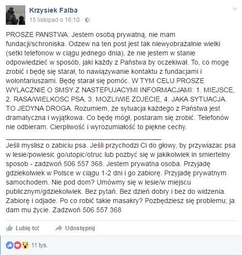 Krzysiek Falba ma 32 lata i jest prywatną osobą, nie prowadzi żadnego schroniska ani fundacji. Post napisał w przypływie emocji, gdy uświadomił sobie, jak wielka jest fala okrucieństwa wobec zwierząt. Ale kierował go do osób, które naprawdę wykorzystały już wszystkie możliwości oddania komuś zwierzaka, a odezwali się ludzie, którym po prostu przybłąkał się pies albo nie radzą sobie z wychowaniem pupila.