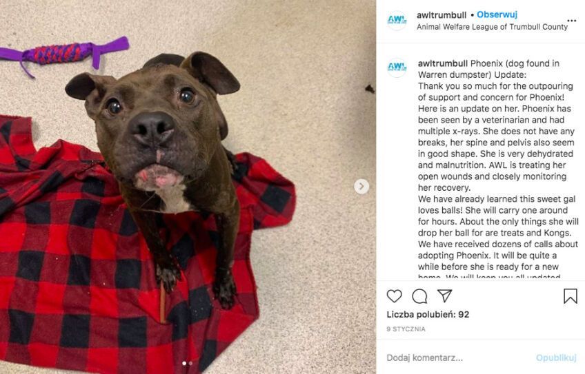 Phoenix zaraz po wyciągnięciu z kontenera na śmieci został zabrany do weterynarza, który zdiagnozował niedowagę i problemy z tylnymi łapami. Przeszłość pitbula nie jest znana. Jednak jego ogólny stan zdrowia, zarówno stare, jak i świeże rany nie wskazują na to, aby kiedykolwiek miał kochający dom, na jaki zasługuje każdy psiak. Obecnie Phoenix dochodzi do siebie w schronisku dla zwierząt Animal Welfare League of Trumbull County.