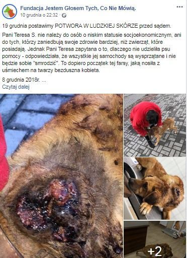 Kolejna wstrząsająca historia, w której główne role odgrywają człowiek i pies. To opowieść, w której zwierzę – zamiast być przywiązane do swojego opiekuna – zostało przywiązane do łańcucha, by cierpieć w samotności. Pies z raną wielkości melona został uratowany przez wolontariuszy z Fundacji Jestem Głosem Tych, Co Nie Mówią 8 grudnia 2018 roku. Uchronili oni zwierzę przed długą i powolną śmiercią w męczarniach. Wolontariusze fundacji czekali na ten dzień ponad rok! W końcu „potwór w ludzkiej skórze” (jak mówią o właścicielce pracownicy organizacji) stanie przed sądem.