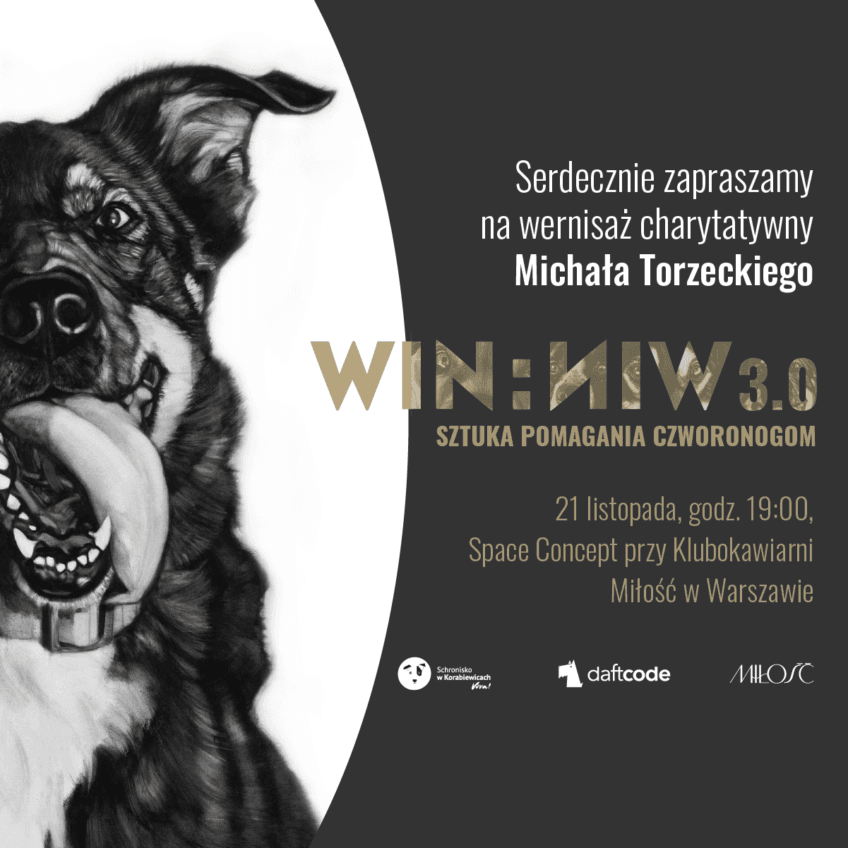 Jesteś miłośnikiem zarówno psów, jak i sztuki? Zatem 21 listopada (czwartek) nie może cię zabraknąć w Przestrzeni Space (wejście od pl. Dąbrowskiego 8)! To już trzecia edycja wernisażu Michała Torzeckiego Win:Win 3.0., na którym będziecie mogli zobaczyć portrety 12 psów ze Schroniska w Korabiewicach. Na wydarzeniu będą również obecne sportretowane zwierzaki, znajdujące się pod opieką fundacji Viva! Akcja dla Zwierząt.