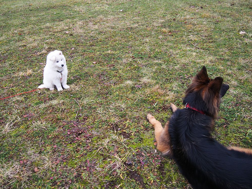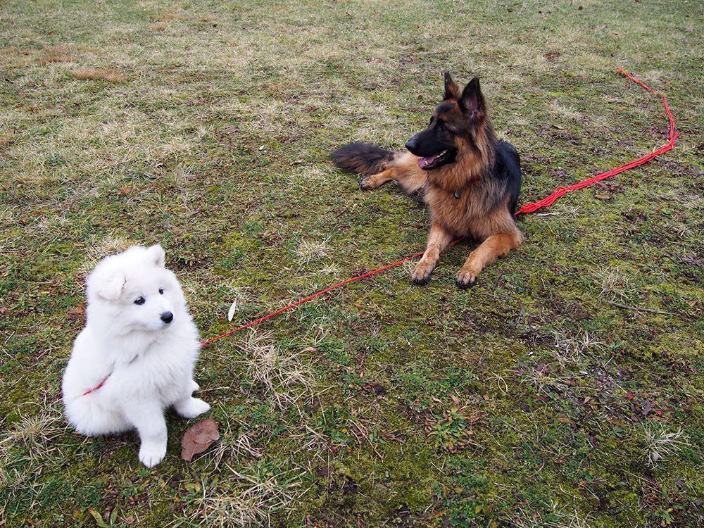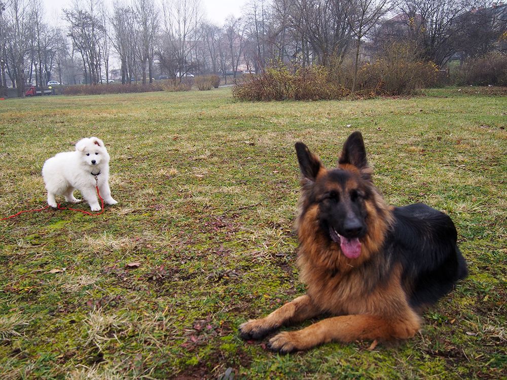 W domu przez pierwsze dni było trochę gorzej – Legion nie była zadowolona z obecności szczeniaka i starała się go ustawiać. Chodziła za nim, obserwowała, co robi, zabraniała mu biegać i tak dalej. Generalnie staraliśmy się nie wtrącać, dopóki nie było to zbyt groźne. Jak Legion przesadzała, to ich rozdzielaliśmy.
